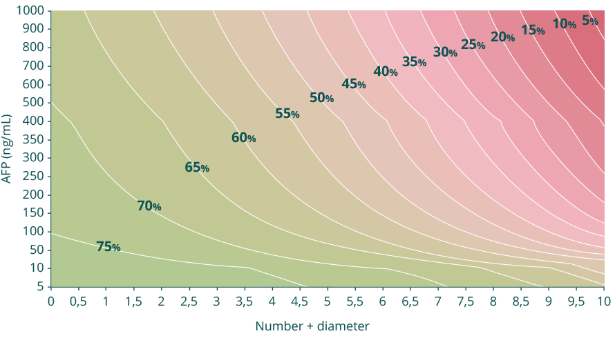 Select size of the largest (vital) tumor and the number of (vital, ≥1cm) tumor nodules and add the last AFP level (in ng/mL). The “calculate” button will then generate the prognosis.